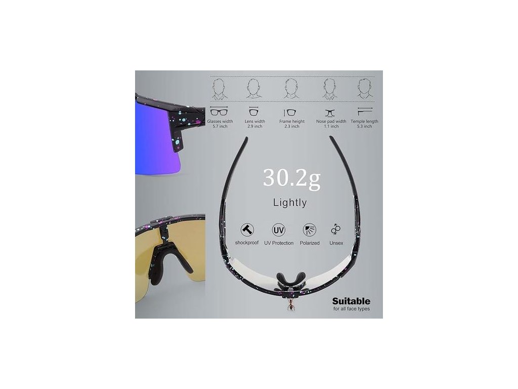 - 3 výměnné objektivy - Hlavní objektiv je barevný objektiv Revo, který nabízí ochranu proti UV záření a oslnění a výborně se hodí pro outdoorové sporty. Šedě polarizovaná čočka může odstranit odraz vody, sněhu a vozovek, obnovit přirozené světlo scény a zabránit silnému slunečnímu záření. Žluté čočky se používají pro noční aktivity, tmavé prostředí nebo deštivé dny pro zlepšení viditelnosti.