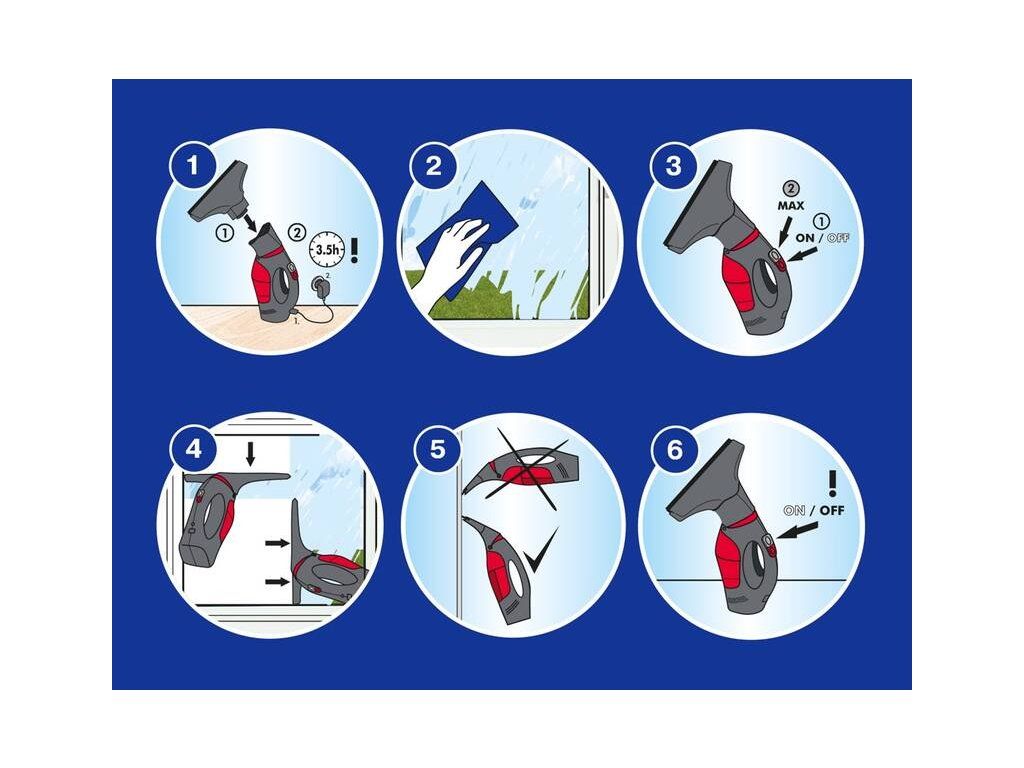 Pořiďte si praktického pomocníka do své domácnosti a ušetřete si spoustu práce a energie. Elektrický čistič oken Vileda Windowmatic s flexibilní hlavicí vám maximálně urychlí a usnadní čištění oken. Špinavou vodu nasává do integrované nádobky o objemu 100 ml a na jedno nabití, které trvá přibližně 4 hodiny, vydrží v provozu neuvěřitelných 40 minut. Vystačí na 120 m2, což je v přepočtu asi 110 oken. Pro ještě větší sací výkon stisknete tlačítko Max a vysavač dokonale vysuší mokrý povrch.