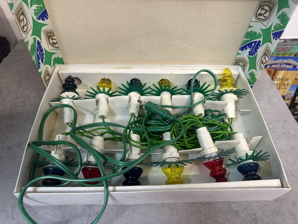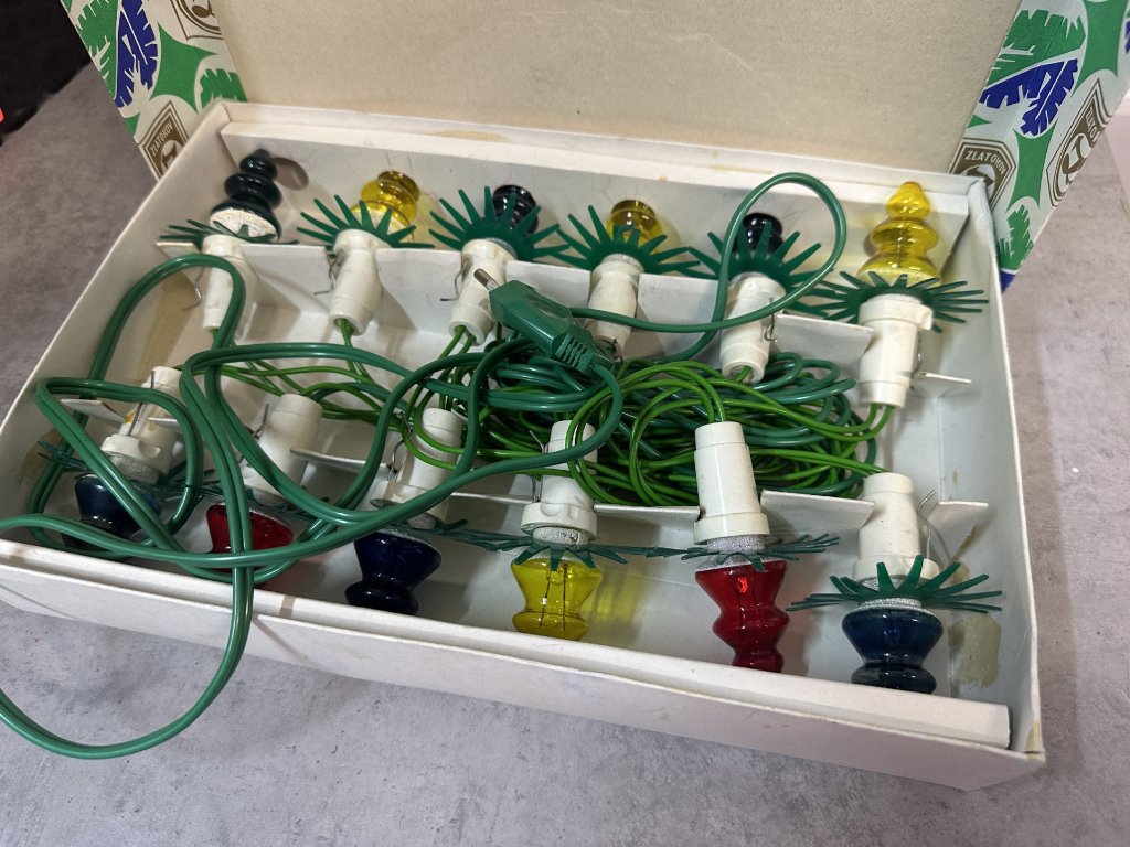 Retro staré elektrické vánoční osvětlení Zlatokov Asteria, svíčky, žárovky, řetěz