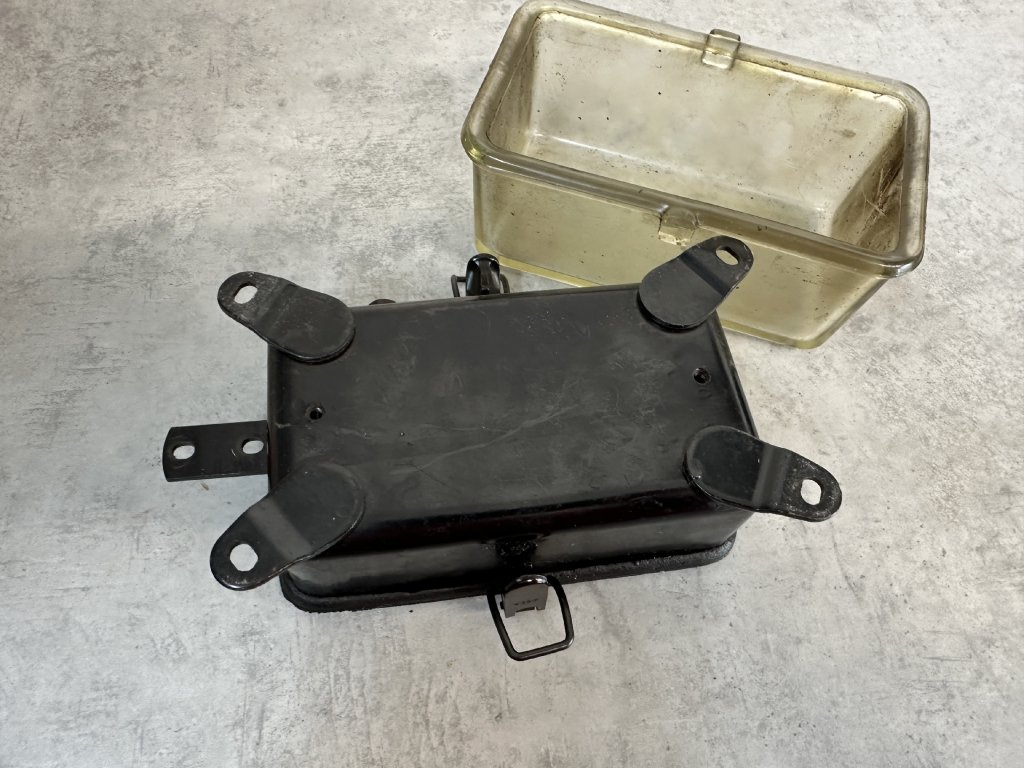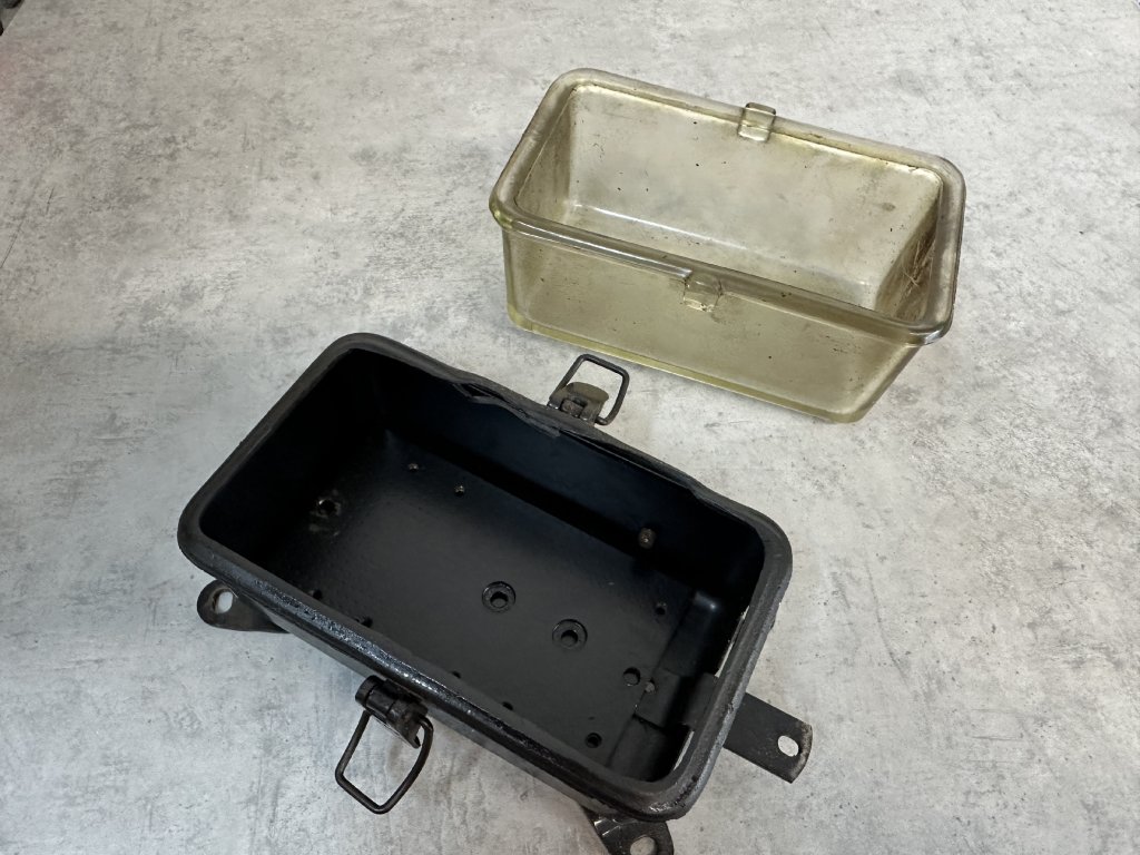 Stará bakelitová krabice SEZ ACIDUR 6455 černá / kovová víko