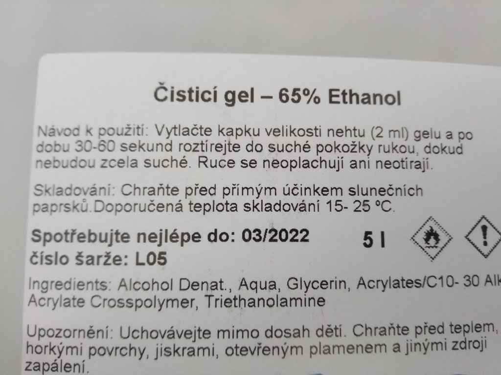 - Čistící gel na ruce - 65% Ethanol.